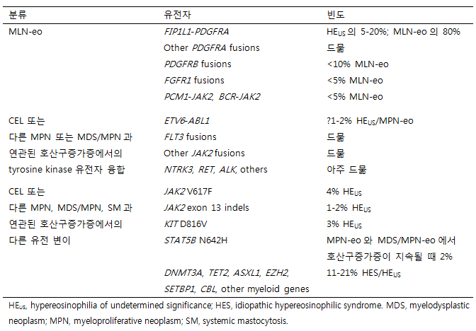 표3. 호산구증가증과 연관된 분자유전학적 이상