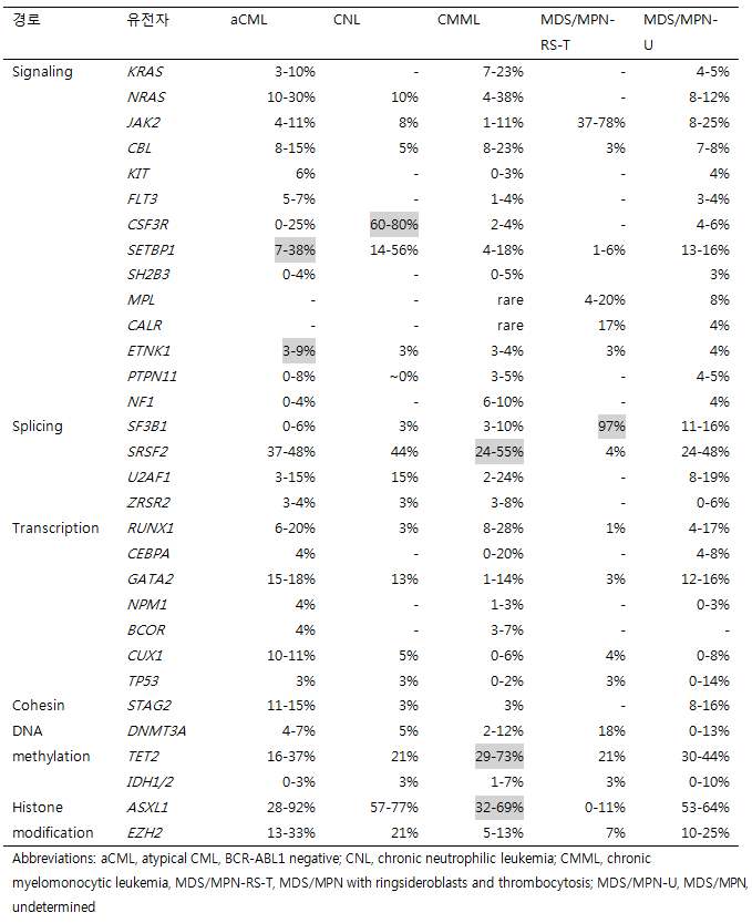 표4. CNL과 MDS/MPN에서의 흔한 유전 변이
