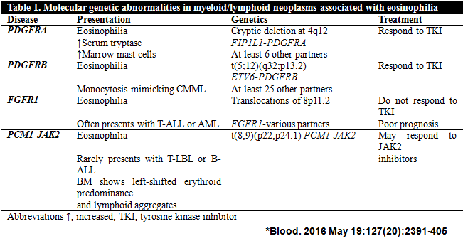 2016 WHO 분류에 근거한 eosinophilia와 연관된 분자유전학적인 이상은 기존의 2008 WHO 분류에서의 주요 유전적 이상(PDGFRA, PDGFRB, FGFR1 관련 유전자재배열) 이외에 PCM1-JAK2 유전자재배열이 추가되었다. 기존의 3가지 유전자 및 유전자재배열들의 특성과 더불어서 새롭게 추가된 PCM1-JAK2 유전자재배열에 대해 간략히 리뷰해 보고자 한다(Table 1). (단, PDGFRA, PDGFRB 및 FGFR1 유전자재배열 관련해서는 현 시점에서 WHO 2016 책자가 출간되기 전인 관계로 기존 WHO 2008 분류 기준으로 임상적 특성 등에 대해서 기술하였음.)