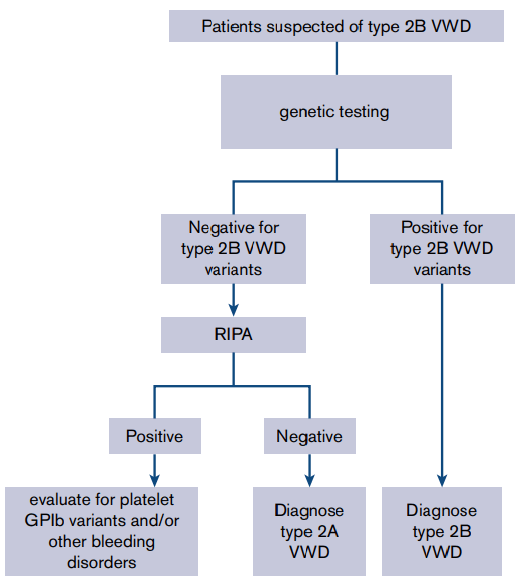 Figure 2. An algorithm for the diagnosis of type 2B VWD. GPIb, glycoprotein Ib;RIPA, ristocetin-induced platelet agglutination.
