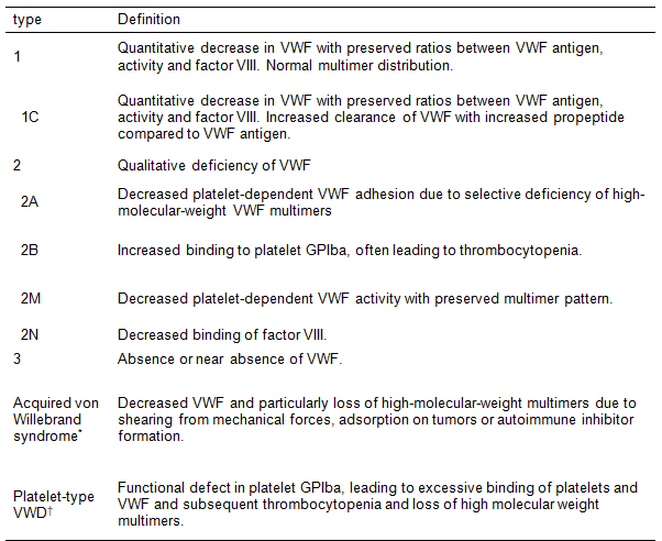 Table 2. Expected laboratory values in vWD by type (https://arupconsult.com/content/von-willebrand-disease)