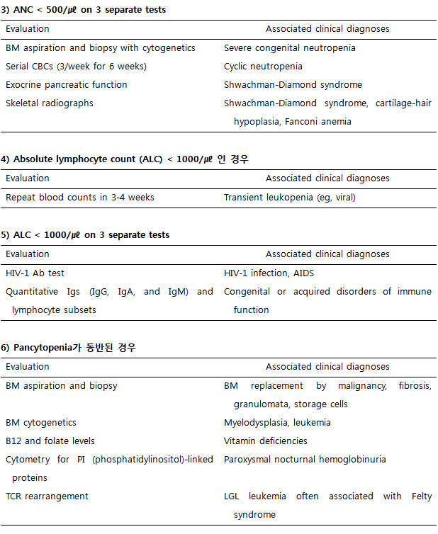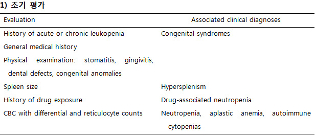 Neutropenia의 간헐적 특성을 고려하여 응급상황이 아닌 경우 주 3회씩 총 6 주간 CBC 및 감별계산 측정과 함께 환자의 감염, 발열, 구강 건강 상태 변화를 기록하게 한다. 골수검사를 통해 혈액종양을 배제하고 골수 세포충실도와 골수구계 성숙도를 확인할 수 있다. Severe congenital neutropenia (SCN)는 promyelocyte stage의 maturation arrest, 골수 hypereosinophilia, monocytosis가 특징이며, Chediak-Higashi syndrome은 large cytoplasmic granules을, Pearson syndrome은 myeloid와 erythroid precursor의 vacuolization을 특징적으로 보인다.