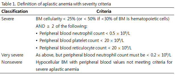 재생불량빈혈은 말초혈액의 세포감소증과 골수 세포충실도 감소의 소견으로 진단되며, 중증도에 따라 흔히 다음과 같이 분류한다(Table 1).