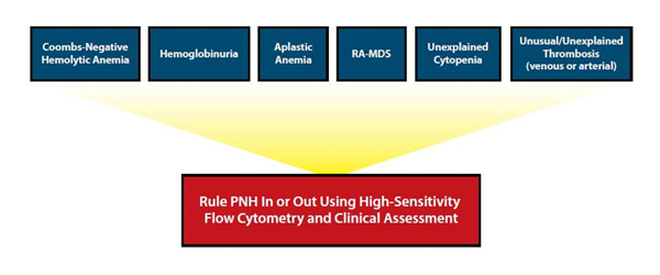 위의 표에 열거된 증상들은 임상에서 흔히 관찰 되는 증상들이며 위와 같은 증상들이 있을 때에 모두 PNH 선별검사를 시행하기는 힘들기 때문에 International Clinical Cytometry Society (ICCS) 가이드라인 및 International PNH Interest Group에 의해 정의된 PNH 고위험군을 대상으로 진단검사를 시행한다.
