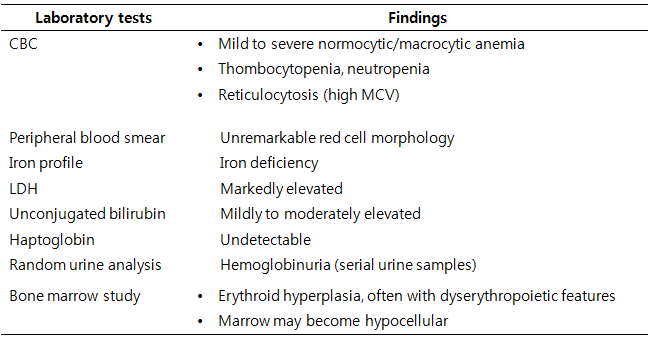 아래와 같은 주요 검사소견을 보일 수 있지만 PNH의 진단과 추적을 위한 표준검사는 유세포분석법을 이용한 GPI anchor 결핍 세포군의 검출 및 정량이다.