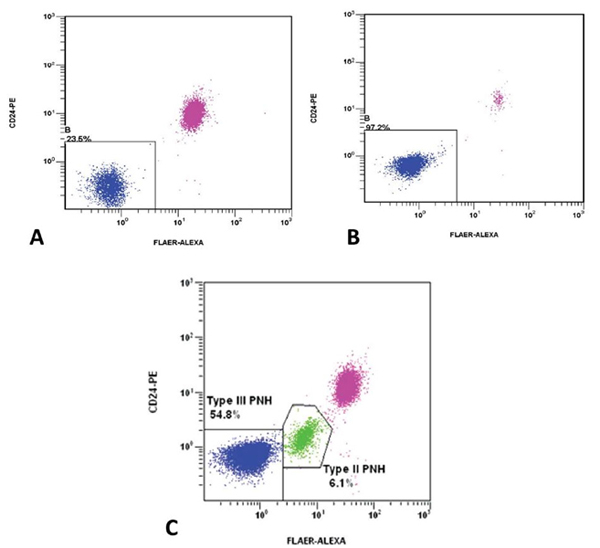 <그림 3> CD24와 FLAER의 조합을 이용한 multicolor assay. A: PNH granulocyte population 23.5%, B: PNH granulocyte population 97%, C: PNH granulocyte population 60.9% (Type III cells 54.8% and Type II 6.1% cells)
