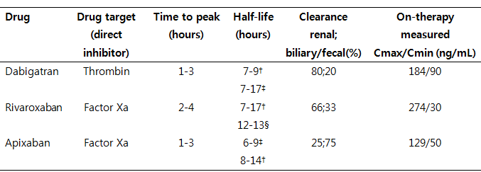 여러가지 DOACs 중에 dabigatran (Pradaxa®), rivaroxaban (Xarelto®), apixaban (Eliquis®) 의 세 종류가 우리나라와 미국을 포함한 여러 국가에서 정맥혈전증과 심방세동의 예방 및 치료에 사용할 수 있도록 승인을 받았다. 상기 약제들의 주요 특징은 Table 2 와 같다.