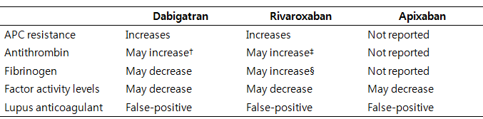 DOACs 은 응고 과정을 억제하기 때문에 hypercoagulable state 를 평가하는데 사용되는 다양한 clot-based assays (antithrombin, protein C activity, protein S activity, APC resistance, lupus anticoagulant) 에 영향을 미칠 수 있다 (Table 5).