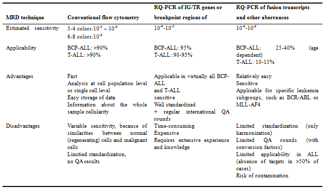 이는 10-4 이상의 민감도를 갖고, 대부분 환자에게 적용가능하고, 빠르고, 정확해야 한다. 최근 van Dongen 등이 정리한 MRD 검출을 위한 대표적인 3가지 방법들의 특징은 아래 표에 정리되어 있다.