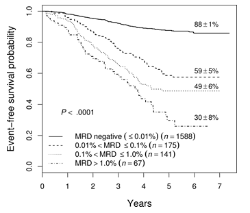 소아 ALL 환자군에서 관해 후 검출되는 MRD 수준이 강력하면서도 독립적인 예후인자로 알려져 있다.
