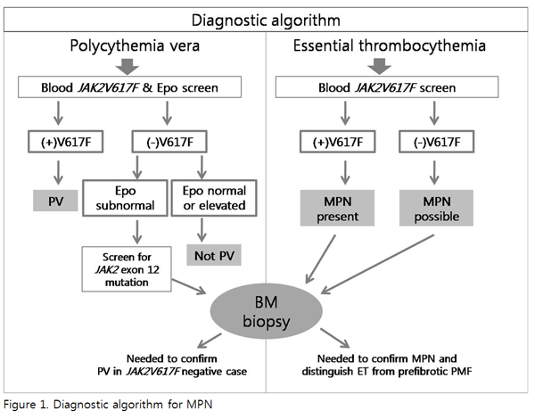 - 말초혈액의 JAK2 V617F 검사를 시작으로 하는 진단 알고리듬은 Figure 1 참고