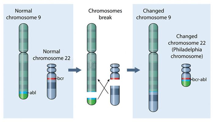 9q34 부위의 유전자는 ABL1이고, 22q11.2 부위는 BCR이라 부른다. 염색질 교환(translocation)에 의해서 22번 염색체에 유전자융합(gene fusion)이 이루어지는데, 이때 만들어지는 BCR-ABL1 융합단백(fusion protein)은 ABL 단백과 비교했을 때 티로신키나제(tyrosine kinase) 활성도가 현저하게 증가한다.