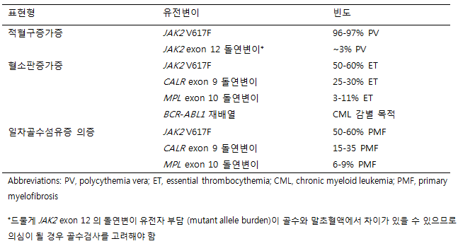 만성골수백혈병(CML) 환자에서 티로신 키나제 억제제(tyrosine kinase inhibitor, TKI) 치료로 분자유전학적 반응이 좋음에도 불구하고 혈소판증가증 또는 다른 MPN의 특성이 관찰될 경우 JAK2 V617F, CALR 돌연변이 검사가 필요하다.