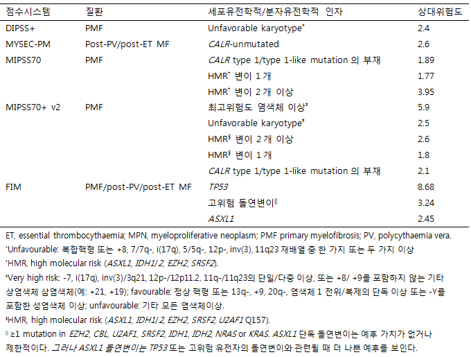 표2. PMF, post-PV MF, post-ET MF의 예후 점수 시스템에서의 세포유전학적 정보와 분자유적학적 정보