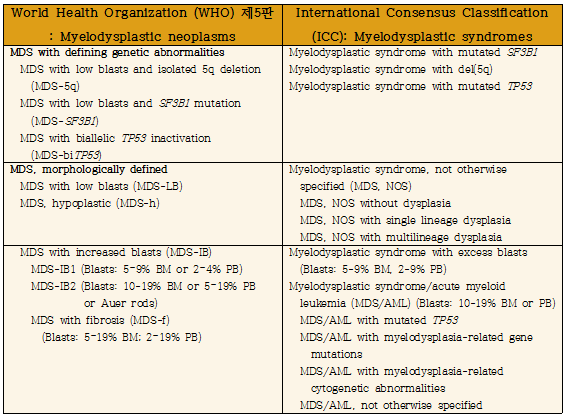1) ICC 개정안에서는 종전과 같이 ‘myelodysplastic syndrome’을 사용하나, WHO 개정안에서는 ‘myelodysplastic neoplasm’으로 명칭이 변경되었으며, 약어는 종전과 같이 ‘MDS’를 그대로 사용한다.