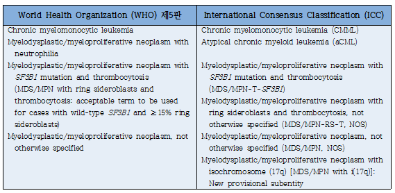 4) 두 분류 모두에서 MDS/MPN with ring sideroblasts and thrombocytosis는 SF3B1 mutation에 근거하여 ‘MDS/MPN with SF3B1 mutation and thrombocytosis’로 명칭이 변경되었다. 하지만 WHO 개정안에서 ‘MDS/MPN with ring sideroblasts and thrombocytosis’라는 용어도 ‘wild-type SF3B1 and ≥15% ring sideroblasts’ case에 적용할 수 있는 용어로 남아있으며, ICC 분류에서는 이러한 경우 ‘MDS/MPN-RS-T, NOS’라고 부른다.