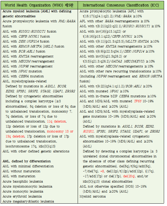5) WHO 개정안에서 종전의 독립된 category였던 'AML with myelodysplasia-related changes (AML-MRC)‘는 'AML, myelodysplasia-related (AML-MR)'로 명칭이 변경되었으며, ‘Acute myeloid leukemia with defining genetic abnormalities’ 내로 편입되었다. Blast 기준은 20% 이상이다. MDS와 MDS/MPN에서 AML로 진행하는 경우는 생물학적 특징을 보다 폭넓게 통합하는 관점에서 AML-MR로 계속 정의하였으나, MPN에서 AML로 진행하는 경우는 MPN category에 남아있다. ICC 개정안에서도 ‘AML-MRC’는 독립된 category에서는 제외되었으며, ‘AML with myelodysplasia-related gene mutations’ 및 ‘AML with myelodysplasia-related cytogenetic abnormalities’의 형태로 남아있다.