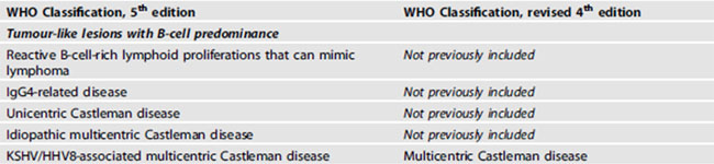 이전에 없었던 tumor-like lesions with B-cell predominance가 생겼고 여기에 다음과 같은 다섯 엔티티가 포함된다.
