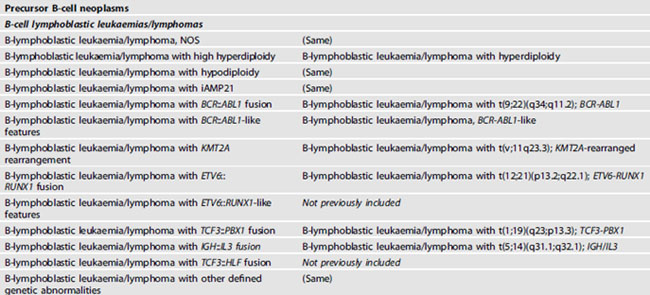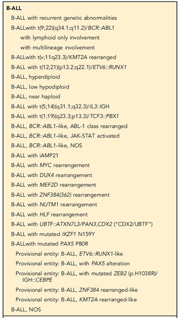 B-ALL에서는 새롭게 유전적으로 정의된 엔티티가 생겼다. Provisional entity였던 B-ALL, BCR-ABL1-like가 B-ALL with BCR::ABL1–like feature로 이름만 조금 바꾸어 정식 엔티티로 포함되었고, B-ALL with ETV6::RUNX1-like features와 B-ALL with TCF3::HLF fusion이 새로 포함되었다. 기본적으로 B-ALL은 세포형태와 면역표현형만 근거해서 B-ALL, not further classified로 진단할 수 있고, B-ALL, NOS는 포괄적인 검사 후에도 분류할 수 없는 경우에만 해야 한다. 대부분의 precursor B-cell neoplasms는 염색체 배수성 변화에 따라 hyperdiploidy나 hypodiploidy로 분류되거나 염색체재배열 혹은 다른 유전학적 변화에 따라 분류된다.