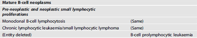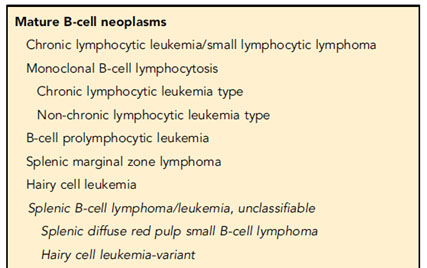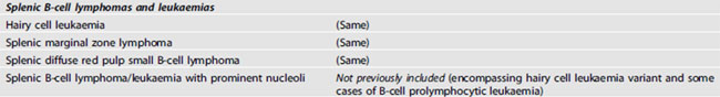 Splenic B-cell lymphoma and leukaemias에서는 splenic B-cell lymphoma/leukaemia with prominent nucleoli가 이전의 hairy-cell leukaemia variant를 대신하고 CD5(-) B-PLL을 흡수한다. Hairy cell leukaemia는 BRAF somatic mutation이 있는 것이 특징이다.