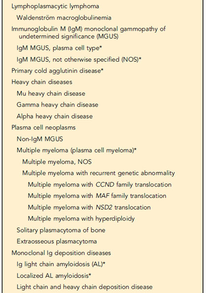 WHO 제 5판에서는 새로운 엔티티들이 들어가고 구조가 조정되었다. 새롭게 포함되는 것은 monoclonal gammopathy of renal significance(MGRS), 저온응집병 (cold agglutinin disease, CAD), 이전에 provisional entity였던 TEMPI증후군, 그리고 AESOP증후군이다. 구조적으로는 paraprotein 종류와 disease burden에 따라 개정되었다. 저온응집병, IgM과 non-IgM MGUS, MGRS가 단클론감마병증(monoclonal gammopathies)으로 분류되고, 비정상적인 단클론성 면역글로불린 침착을 가지는 질병들이 함께 분류되며, 중쇄질환(heavy chain diseases)이 이제 형질세포질환에 포함된다.
