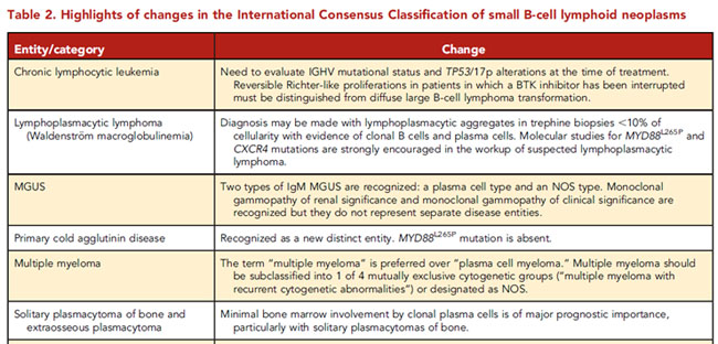 B세포 림프계종양의 ICC 변화의 주요한 내용을 요약한 표를 보면 CLL에서는 치료시점에서 immunoglobulin gene heavy chain variable region 변이 상태와 TP53/17p alteration에 대해 확인하고, LPL 검사시 MYD88과 CXCR4 변이를 확인하라고 한다. MGUS는 plasma cell type과 NOS type이 있고, monoclonal gammopathy of renal significance와 of clinical significance는 별개의 질환은 아니라고 한다. 저온응집병이 새로운 엔티티고, plasma cell myeloma보다는 multiple myeloma용어가 선호되며 세포유전학적 그룹에 따라 재분류 된다고 한다. 골단발형질세포종(solitary plasmacytoma of bone)과 골외형질세포종(extraosseous plasmacytoma)에서는 클론성 형질세포에 의한 최소골수침습(minimal bone marrow involvement)이 예후에 주요하다.