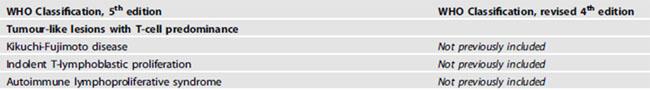 B세포와 마찬가지로 T세포에서도 tumor-like lesions가 WHO 제 5판에 새로 포함되었다.