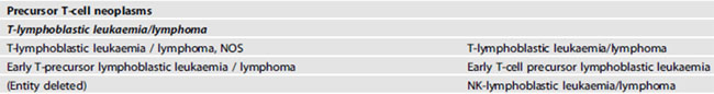 T-ALL에서는 이전에 있었던 NK-lymphoblastic leukemia/lymphoma가 별개의 엔티티로 구분되지 않는다. 명확하고 신뢰할 수 있는 진단 기준이 없고, CD94나 CD161과 같은 NK cell 관련 항원 발현에 대한 공개 정보가 부족하며, 형태학적 그리고 면역표현학적으로 다른 엔티티들과 겹치기 때문이다.