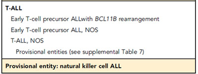 ICC에서는 Early T-cell precursor (ETP) ALL과 T-ALL, NOS는 WHO 제 5판과 같다. ETP ALL의 1/3이 T-lineage transcription factor gene인 BCL11B의 rearrangement와 deregulation이 특징이어서 따로 구분했고, NK cell ALL은 provisional entity로 두었다.