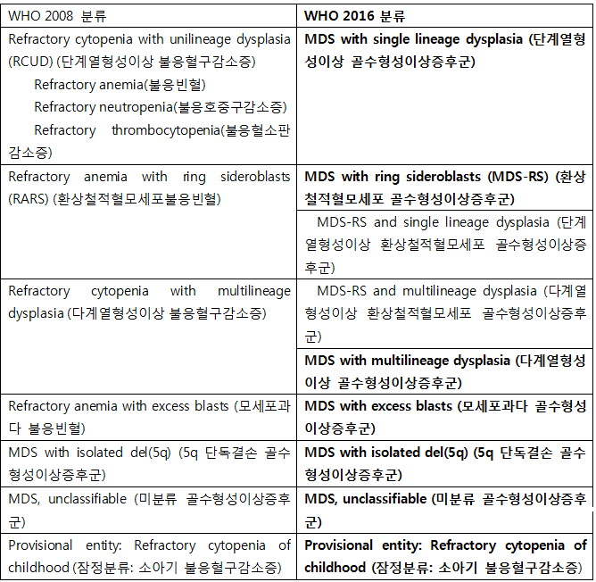- 진단명에 포함된 불응빈혈(refractory anemia) 또는 불응혈구감소증(refractory cytopenia)을 명칭에서 제외하고 골수형성이상증후군(MDS)로 변경하였다.
