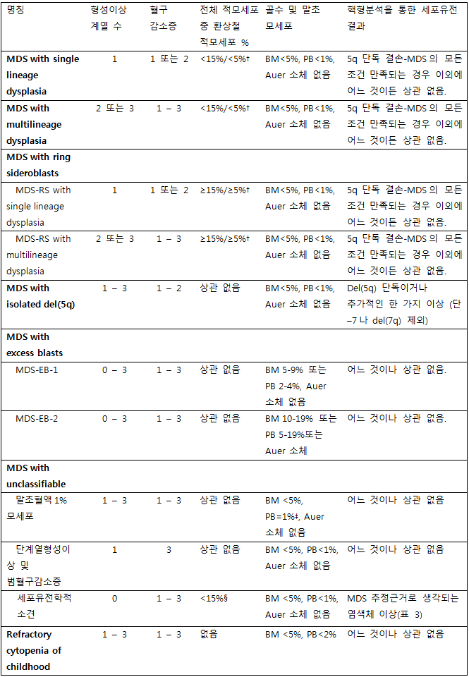 세계보건기구(World Health Organization)의 조혈 및 림프구계 조직의 분류 진단기준이 2016년 개정되었다. 2016년 WHO의 골수형성이상증후군의 진단 기준에서는 형태학적 소견 및 혈구 감소증의 수치를 재평가하였고 최근에 밝혀진 골수형성이상증후군에 대한 유전 정보를 포함하도록 하였다. 2016년 WHO 분류에 의한 골수형성이상증후군은 표1과 같다.