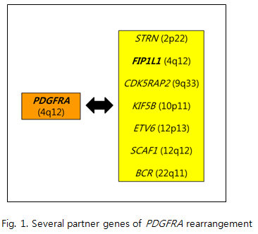 클론성 호산구증가증에서 PDGFRA 유전자 이상과 연관된 가장 대표적인 유전자재배열은 FIP1L1-PDGFRA rearrangement로서, 4q12의 cryptic(interstitial) deletion에 의해 형성되는 것으로 알려져 있다. 이외에 PDGFRA 유전자는 적어도 6개의 파트너 유전자들(STRN, CDK5RAP2, KIF5B, ETV6, SCAF1 및 BCR)과 특정한 유전자재배열을 형성하는 것으로 보고되었다(Fig. 1). FIP1L1-PDGFRA는 남성에서 더욱 흔한 것으로 알려져 있으며(M:F=~17:1), 주로 발생하는 연령대는 25세에서 55세 사이로 알려져 있다. 임상양상은 일반적으로 CEL로 오지만, 경우에 따라서 acute myeloid leukemia(AML) 혹은 T-lymphoblastic lymphoma(T-LBL)로 나타날 수 있고, CEL 이후에 acute transformation의 형태로 진행하기도 한다. FIP1L1-PDGFRA를 동반하는 CEL은 multisystem disorder로서, 말초혈액과 골수를 침범한다. 말초혈액 내에서의 특징은 현저한 호산구증가증을 보일 뿐만 아니라, 빈혈 및 혈소판감소증 소견을 동반할 수 있다. 골수 내에서는 호산구 및 전구세포들의 증식을 포함한 세포충실도 증가 소견뿐만 아니라 mast cell이 증가될 수 있다. 또한, 호산구의 조직 침윤(tissue infiltration) 및 호산구에서의 싸이토카인 분비에 의해서 심장, 폐, 신경계, 피부 및 소화기계 등에 조직 손상(tissue damage)을 초래할 수 있다. 대부분의 환자에서 비장비대가 동반되며, 심장섬유화 등에 따른 심각한 임상증상이 나타날 수 있다. 혈청내 tryptase가 보통 증가되나, mast cell disease 보다는 덜 현저한 편이다. 또한, 비타민 B12가 현저하게 증가될 수 있다. FIP1L1-PDGFRA 유전자재배열은 cryptic deletion에 의해 형성되므로 염색체검사로는 검출되지 않으나, RT-PCR 혹은 FISH 검사로 확인이 가능하다. PDGFRA 연관 유전자재배열을 가지는 환자의 경우 tyrosine kinase inhibitor(TKI)에 잘 반응하는 것으로 보고되었으며, 심장 손상(cardiac damage)이 일어나지 않은 상태라면 imatinib 치료시 예후가 좋은 것으로 알려져 있다.