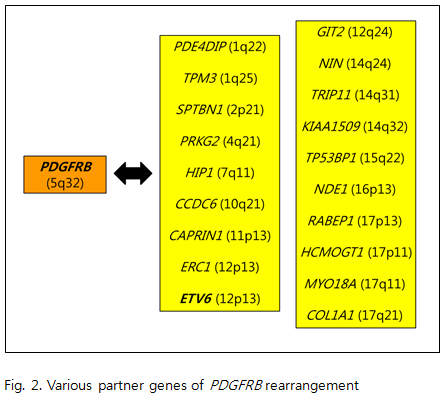 클론성 호산구증가증과 연관된 PDGFRB 유전자는 ETV6 유전자와의 ETV6-PDGFRB 유전자재배열 이외에 적어도 25개의 파트너 유전자들과 특정한 유전자재배열을 형성하는 것으로 알려져 있다(Fig. 2). PDGFRB 연관 유전자재배열은 남성에서 더욱 빈번한 것으로 알려져 있으며(M:F=2:1), 주로 발생하는 연령대는 40대 후반의 중년에서이다. 임상양상은 주로 chronic myelomonocytic leukemia(CMML)의 형태로 오지만, 어떤 환자들은 atypical chronic myeloid leukemia(aCML), MPN이나 AML 등 다양한 형태로 발현될 수 있다. PDGFRB 유전자재배열을 동반하는 CEL은 PDGFRA 이상에서와 마찬가지로 multisystem disorder로서, 말초혈액과 골수를 침범한다. 말초혈액에서는 백혈구 숫자가 증가하고, 빈혈이나 혈소판감소증 등이 동반될 수 있다. 또한, 호중구, 호산구, 단구 및 해당 전구세포들이 다양한 정도로 증가할 수 있으며, 드물게 호염기구의 현저한 증가가 있을 수 있다. 골수 내에서는 활발한 골수구계(호중구, 호산구) 세포들의 증식에 의해서 세포충실도가 증가하고, mast cell 및 reticulin의 증가가 나타날 수 있다. 비장비대가 대부분의 환자에서 동반되며, 간, 심장, 피부 등을 침범해서 간비대나 심장 손상(cardiac damage) 및 심부전(cardiac failure) 등을 초래할 수 있다. 혈청내 tryptase가 경도 혹은 중등도로 증가할 수 있다. 지금까지 보고된 증례들에서 염색체 검사상 5q31~33에서의 breakpoint가 확인되었다. 따라서, 염색체 검사상 PDGFRB 유전자재배열이 의심되는 환자에서 PDGFRB FISH 검사(break-apart FISH with a PDGFRB probe)를 추가적으로 시행하는 것이 진단에 도움이 될 수 있다. FISH 검사로 PDGFRB 유전자재배열이 확인되지 않는 경우 Southern Blot analysis를 진단에 활용할 수 있겠다. imatinib이 사용되기 전 PDGFRB 유전자재배열 환자군의 평균 생존기간은 2년 미만이었다. 그러나, imatinib으로 치료받은 일부 환자에서 65개월 이상의 median survival을 나타내어, PDGFRB 연관 유전자재배열을 가지는 환자의 경우에도 PDGFRA에서와 마찬가지로 TKI에 잘 반응하는 것으로 여겨진다.