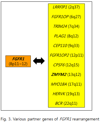 클론성 호산구증가증과 연관된 세번째 유전자는 FGFR1로서 적어도 10여개의 파트너 유전자들과 다양한 유전자재배열을 형성하는 것으로 알려져 있다(Fig. 3). 흥미롭게도, FGFR1와 연관된 본 유전자재배열은 FGFR1 유전자의 염색체상 위치(8p11~12) 때문에 과거로부터 “8p11 myeloproliferative syndrome(EMS)”으로 불리워 왔으며, 현재는 독립적인 myeloid/lymphoid neoplasms군으로 분류되고 있다. FGFR1 연관 유전자재배열은 PDGFRA, PDGFRB 유전자 이상과 비교해서 상대적으로 남성에서의 predominance가 뚜렷하지 않으며, 어린이에서부터 노인에 이르기까지 폭넓은 연령대에서 나타났으나 대부분 평균 발병 연령은 30대 초반의 젊은 환자에서 보고되었다. 임상양상은 다양한 형태로 나타날 수 있는데, CEL, AML, T-LBL, 그리고 경우에 따라서 드물게 precursor B lymphoblastic leukemia/lymphoma 로 발현된다(lymphoblastic lymphoma의 경우 t(8;13) 혹은 ZMYM2-FGFR1 유전자재배열을 동반하는 경우에 더욱 흔한 것으로 알려져 있다). 1차적으로 침범하는 기관은 말초혈액, 골수, 림프계, 간 및 비장 등이며, 림프절종대(lymphadenopathy)는 lymphoblasts 혹은 myeloid cells의 침윤의 결과로 나타난다. 약 90%의 환자에서 말초혈액 혹은 골수에서 호산구증가증 소견을 나타낸다. 호염기구증가는 일반적으로 뚜렷하지 않으나, BCR-FGFR1 유전자재배열을 가지는 경우에 동반될 수 있다. FGFR1 유전자재배열을 동반하는 만성기의 환자들은 주로 호산구증가증 및 호중구증가증을 나타내며, 경우에 따라서 단구증가증을 나타낼 수 있다. 또한, 이러한 환자들에서 관찰되는 호산구들은 악성 클론(neoplastic clone)으로 간주되며, 급성기로 넘어가면서(acute transformation) lymphoblasts 혹은 myeloblasts가 동반될 수 있다. PDGFRB 유전자 이상시에서와 마찬가지로 염색체 검사에서 8p11 abnormality를 의심할 수 있으며, FGFR1 유전자재배열이 예상되는 환자에서 FISH 혹은 RT-PCR 검사를 시행하는 것이 확진에 도움을 준다. PDGFRA, PDGFRB 유전자재배열을 동반하는 환자들에서와는 달리 TKI 치료시에 반응하지 않는 것으로 알려져 있으며, 환자들의 예후는 현재까지 좋지 않다. 따라서, 현재 FGFR1 유전자재배열을 동반한 만성기 환자에서는 치료적 옵션으로 조혈모세포이식(stem cell transplantation)을 고려해야 한다.