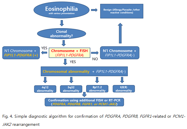 1. PDGFRA, PDGFRB, FGFR1 관련/: 각각의 유전자는 염색체의 4q12, 5q32 및 8p11 부위에 위치하고 있으며, 드물지만 다양한 종류의 chromosomal translocation과 연관됨. cryptic deletion인 경우(eg. FIP1L1-PDGFRA)를 제외하고 대부분의 경우 염색체 검사에서 존재 여부를 의심할 수 있으며, 각각의 FISH 검사를 통해서 확인 가능함.