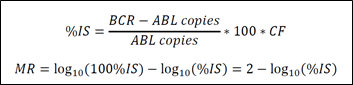BCR-ABL1 fusion transcript 정량 보고는 WHO primary reference materials 에 traceability 가 있는 IS calibrator 도입으로 표준화가 이루어졌고, 검사실 간, 검사법 결과값의 호환이 가능하게 되었다[9]. % IS와 molecular log reduction (MR) level 의 관계는 다음과 같다.