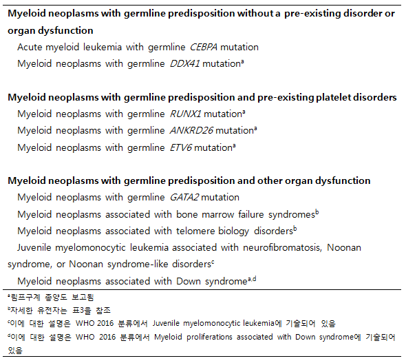 표1. 2016 WHO에 따른 생식세포변이에 의한 골수구계 종양 (Myeloid neoplasm with germline predisposition)의 분류