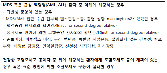 생식세포변이에 의한 골수구계 종양 에 특징적인 임상 양상은 없지만 많은 경우 germline mutation에 따라 비종양성 혈액질환, 다른 장기의 이상, 증후군성 질환이 나타날 수 있으며 혈액 질환이 나타나기 전부터 발현되는 경우도 많다. 생식세포 변이에 의한 골수구계 종양을 의심해야 할 경우는 표2에 정리되어 있다.