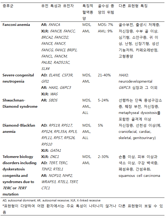 예전부터 잘 알려져 있던 소아기에 많이 진단되는 고전적인 질환들과 연관되어 있는 진단으로 각 질환에 따른 특성 및 관련 유전자는 표3에 정리되어 있다. 질환에 따라서 매우 다양한 표현형을 나타내게 된다. Fanconi anemia, Shwachman-Diamond syndrome, Diamond-Blackfan anemia, severe congenital neutropenia 등을 포함하며 ALL로 발병한 경우도 보고되었지만 주로는 MDS와 AML이 주된 혈액종양이다.
