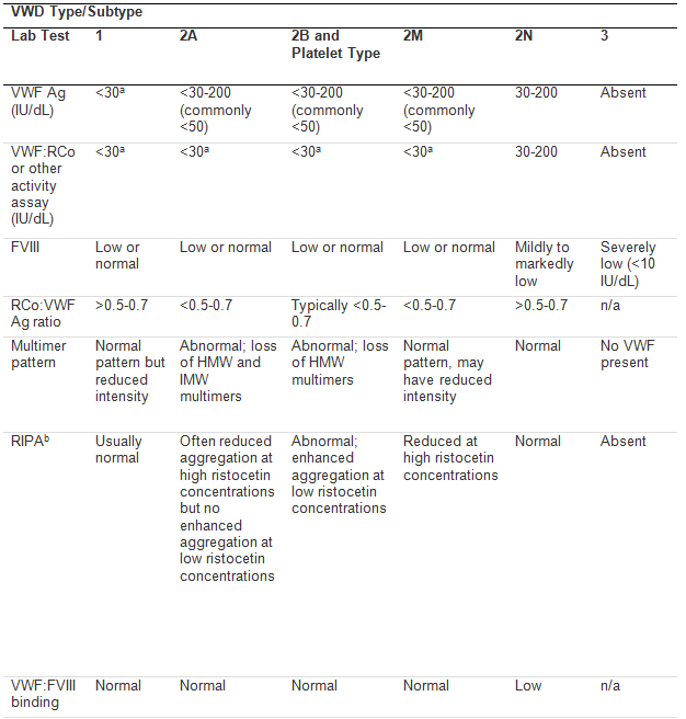 Table 2. Expected laboratory values in vWD by type (https://arupconsult.com/content/von-willebrand-disease)