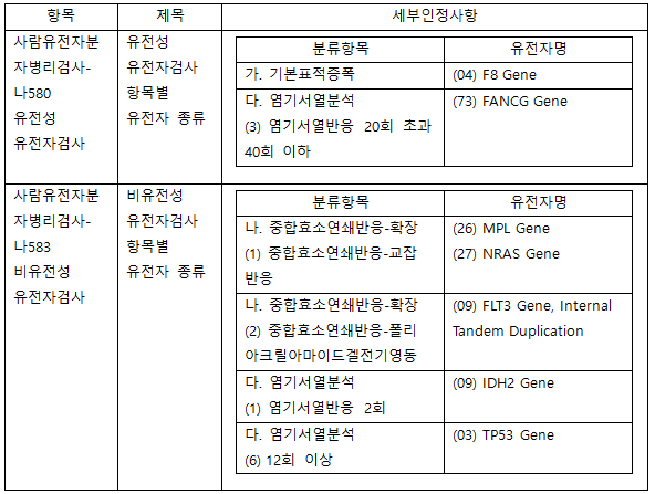 1. 신설된 급여목록: 요양급여의 적용기준 및 방법에 관한 세부사항 일부개정에서 아래와 같이 분류항목과 유전자명이 신설되었습니다.