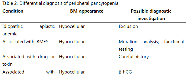 재생불량빈혈은 말초혈액의 세포감소증과 골수 세포충실도 감소의 소견으로 진단되며, 중증도에 따라 흔히 다음과 같이 분류한다(Table 1).