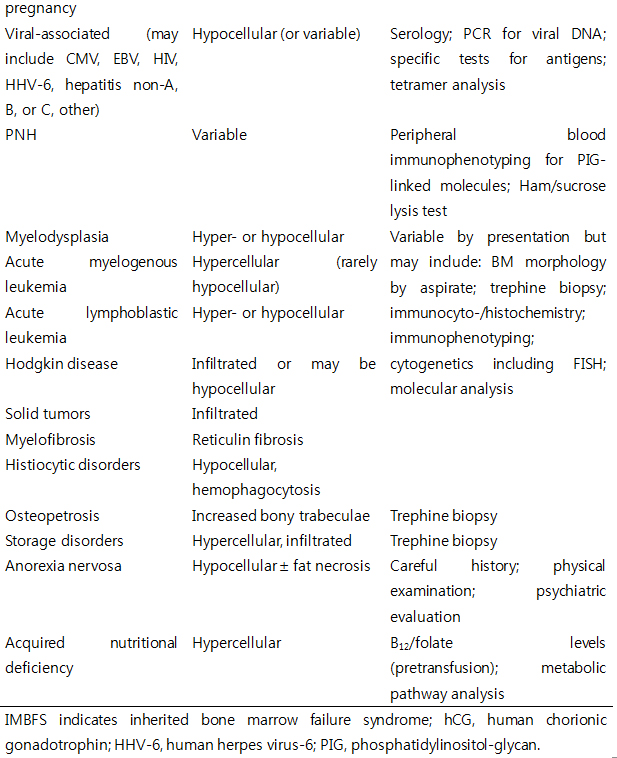 재생불량빈혈의 진단은 골수부전의 원인이 되는 다른 질환들을 배제함으로써 이루어진다(Table 2). 현재 다양한 검사들이 있지만, 문진과 진찰이 필수적이다. 문진을 통해 골수부전과 연관된 약물 또는 독소에 대한 노출 여부를 확인한다. 진찰로 질병특유의 소견을 가지는 것으로 여겨졌던 다른 원인질환들을 완전히 배제하는 데에는 한계가 있다. 선천재생불량빈혈(inherited BM failure syndromes, IBMFS)에 대한 유전자검사가 진단에 도움이 되나, 아직 모든 유전자변이가 밝혀져 있지 않으므로 불완전한 정보를 제공한다.