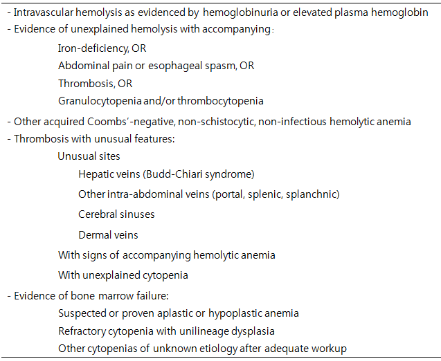 위의 표에 열거된 증상들은 임상에서 흔히 관찰 되는 증상들이며 위와 같은 증상들이 있을 때에 모두 PNH 선별검사를 시행하기는 힘들기 때문에 International Clinical Cytometry Society (ICCS) 가이드라인 및 International PNH Interest Group에 의해 정의된 PNH 고위험군을 대상으로 진단검사를 시행한다.