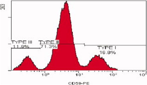 - GPI anchor 결합 단백이 완전히 소실된 세포(type III cell)를 정상 적혈구(type I cell)와 구분하여 정량 하는 것이 목적이며 부분적으로 소실된 세포(type II cell)도 정량이 가능