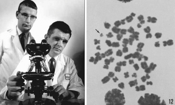 펜실바니아의대 병리학교실의 종양생물학자인 Peter C. Nowell (1928-2016) 박사가 이와 같은 염색체 이상을 처음 발견했고, 필라델피아 염색체라고 이름을 붙인 것은 1960년이었다. 1956년에 인체 염색체 수는 46개라는 것이 처음으로 밝혀질 정도로 당시 염색체 연구의 역사는 매우 짧았다. 염색체 이상을 찾기 위해서는 분열세포를 현미경으로 사진 촬영한 후 염색체를 하나 하나씩 잘라내고 크기 순으로 배열했다.